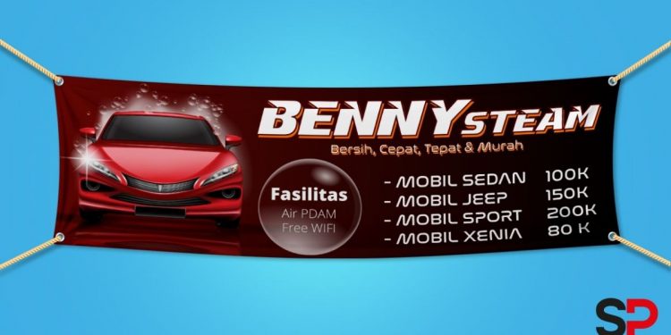 Desain lain yang dapat membuat bisnis cuci mobil terlihat mencolok adalah penggunaan spanduk dengan desain yang terlihat mewah atau glamor. Dengan menggunakan desain seperti ini bisnis tersebut akan memiliki kesan yang eksklusif. Untuk membuat contoh spanduk cuci mobil mewah, Anda dapat melihat contoh desain di atas. Penggunaan warna merah tua bergradasi warna hitam dengan ilustrasi mobil mewah berwarna senada bisa diterapkan. Selain itu, isi dari spanduk tersebut harus jelas serta terinci dengan baik sehingga konsumen akan langsung paham.